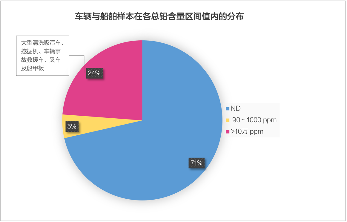約1/4的車輛與船舶樣本的總鉛含量超過10萬ppm,遠超國家標準的限定值。另外,道路標線、大橋欄桿和橋梁等室外場景的樣本含鉛總量幾乎都高于10萬ppm,這些面漆老化脫落后會進入自然環(huán)境中,可影響陸地、海洋以及水生生態(tài)系統(tǒng),亦可通過粉塵的形式被人體吸入或攝入。