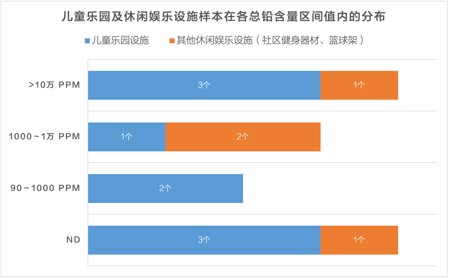 如下圖所示,在13個休閑娛樂場所類場景樣本中,9個是兒童游樂場設施,1個室外籃球架,3個社區(qū)健身器材。其中有4個樣本未檢測出重金屬鉛(約占該場景樣本總數(shù)的31%),7個樣本的總鉛含量高于1000ppm(約占54%),4個高于10萬ppm(約占31%)。值得注意的是,兒童游樂場設施樣本中有6個總鉛含量超過90ppm ,其中3個超過10萬ppm,分別占兒童娛樂設施樣本總數(shù)的67%與33%。其中一個兒童娛樂設施的面漆總鉛含量甚至遠超所有其他場景的樣本,可嚴重危害到兒童的身體健康。