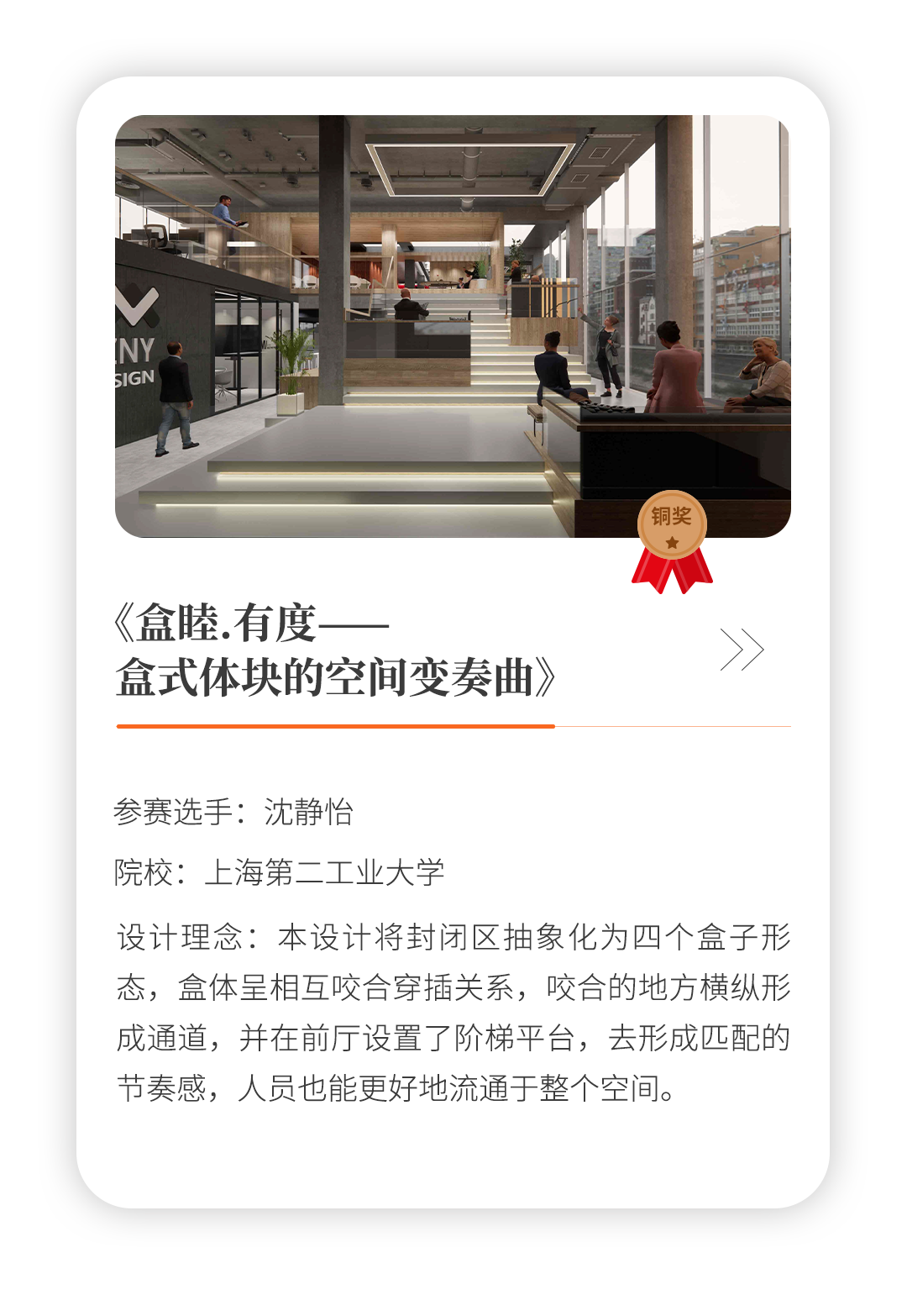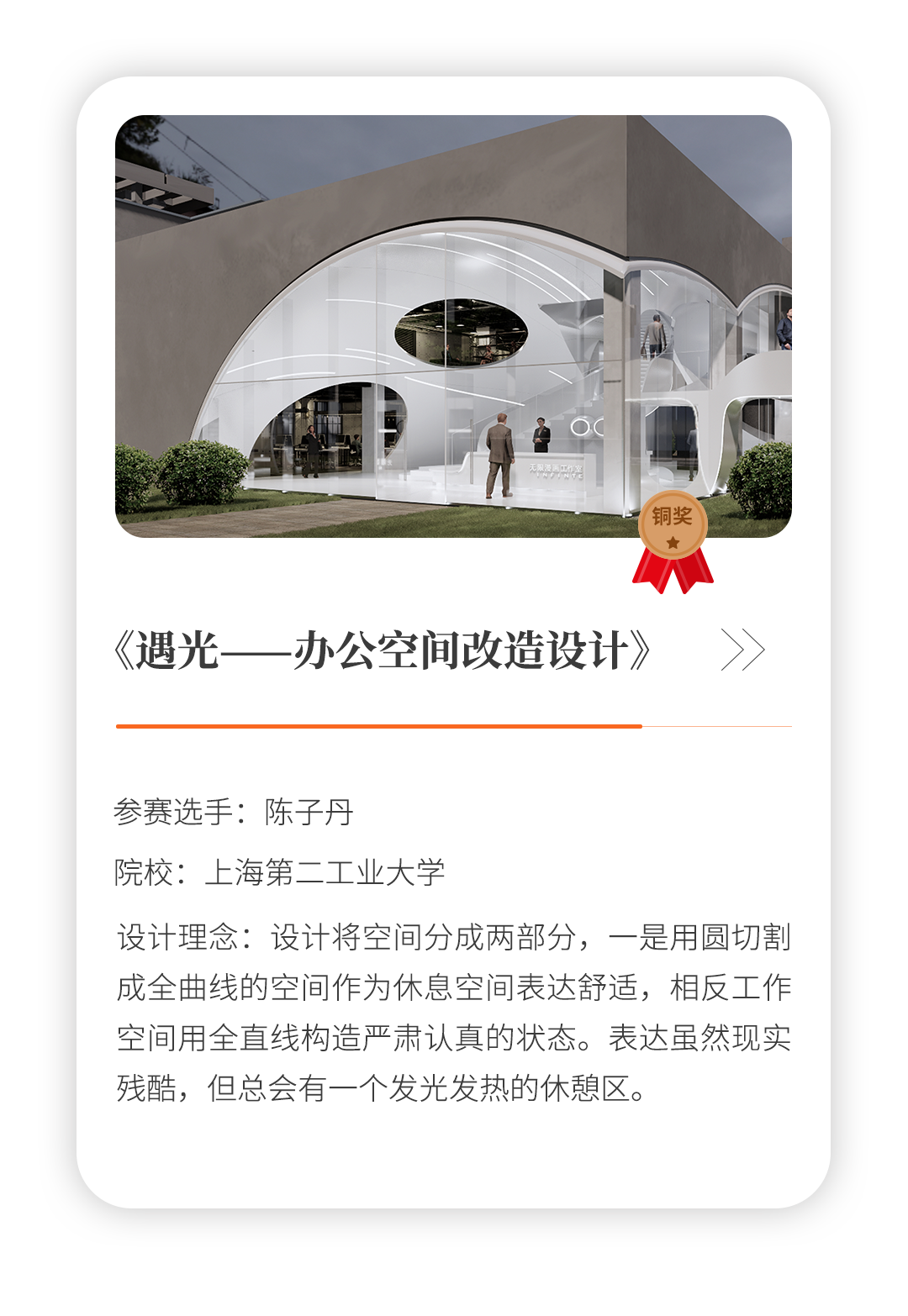 該作品提取《盜夢(mèng)空間》中經(jīng)典的夢(mèng)境的世界觀,以層層嵌套的夢(mèng)境為深入線索,運(yùn)用具象與抽象相結(jié)合、空間內(nèi)部與空間邊界虛實(shí)變化等方式,塑造出一個(gè)遠(yuǎn)離真實(shí)世界的第三世界——沉浸式酒吧。作品通過(guò)獨(dú)特的空間結(jié)構(gòu)、色彩與材質(zhì)的創(chuàng)意性突破,營(yíng)造出了一個(gè)有利于身心放松的室內(nèi)空間環(huán)境,希望客人們?cè)谝惶斓姆泵诼抵笞哌M(jìn)酒吧,能夠像進(jìn)入夢(mèng)鄉(xiāng)沉浸于夢(mèng)中那般的愉悅,與空間進(jìn)行更深層次的交互,充分展示了出未來(lái)理想人居空間的藍(lán)圖。