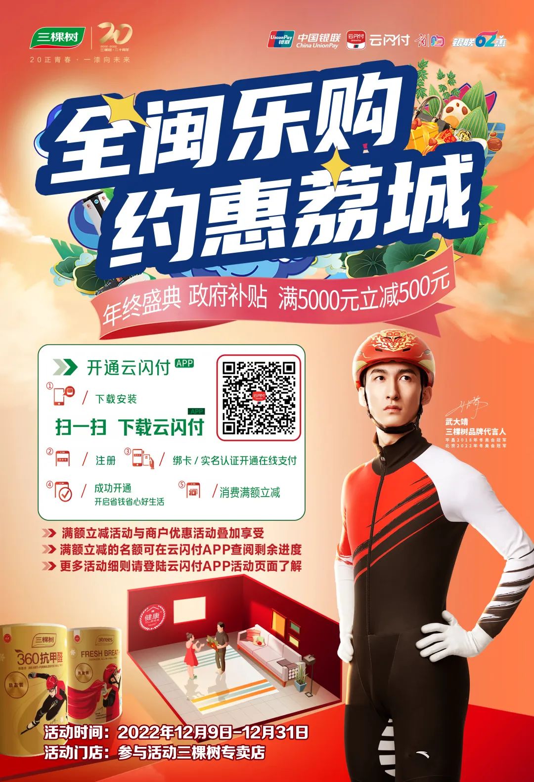 “全閩樂購 約惠荔城”三棵樹專場年終促消費活動在2022年12月9日-31日盛大開展,莆田荔城區(qū)政府及三棵樹集團共同注資百萬現(xiàn)金促消費,通過云閃付平臺立減,門店產(chǎn)品讓利,實實在在讓老百姓獲得實惠,提升廣大業(yè)主的裝修欲望,提振消費信心,帶動莆田GDP發(fā)展。