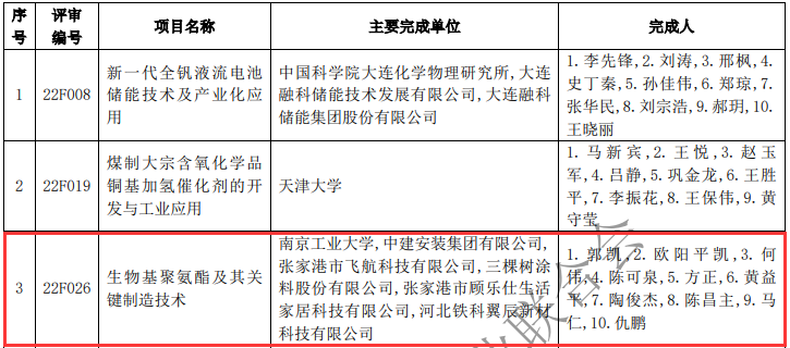 由南京工業(yè)大學、中建安裝集團有限公司、張家港市飛航科技有限公司、三棵樹涂料股份有限公司、張家港市顧樂仕生活家居科技有限公司、河北鐵科翼辰新材科技有限公司完成的《生物基聚氨酯及其關(guān)鍵制造技術(shù)》榮獲技術(shù)發(fā)明一等獎。