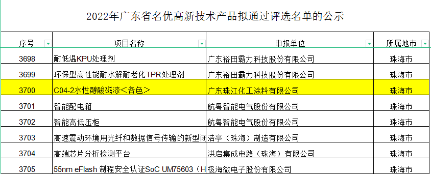 近日,廣東省高新技術(shù)企業(yè)協(xié)會公布了2022年廣東省名優(yōu)高新技術(shù)產(chǎn)品擬通過評選名單,珠江涂料申報的各色C04-2水性醇酸磁漆產(chǎn)品成功入選“2022年廣東省名優(yōu)高新技術(shù)產(chǎn)品”名單。