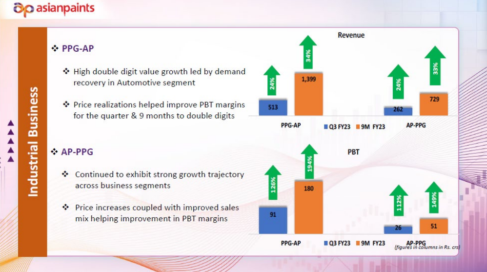 亞洲涂料的工業(yè)涂料業(yè)務(wù),主要由亞洲涂料與PPG合資的兩家公司,PPG-AP和AP-PPG來(lái)經(jīng)營(yíng)。自2022下半年印度汽車工業(yè)出現(xiàn)復(fù)蘇,PPG-AG工業(yè)涂料業(yè)務(wù)受到提振,在2023財(cái)年的九個(gè)月時(shí)間內(nèi),PPG-AP板塊的增長(zhǎng)率已經(jīng)超過(guò)34%,PPG-AG前九個(gè)月利潤(rùn)約為9.1億盧比,利潤(rùn)增幅194%。另一方面,AP-PPG 本季度銷售額增幅為24%,前九個(gè)月利潤(rùn)約為5.1億盧比。