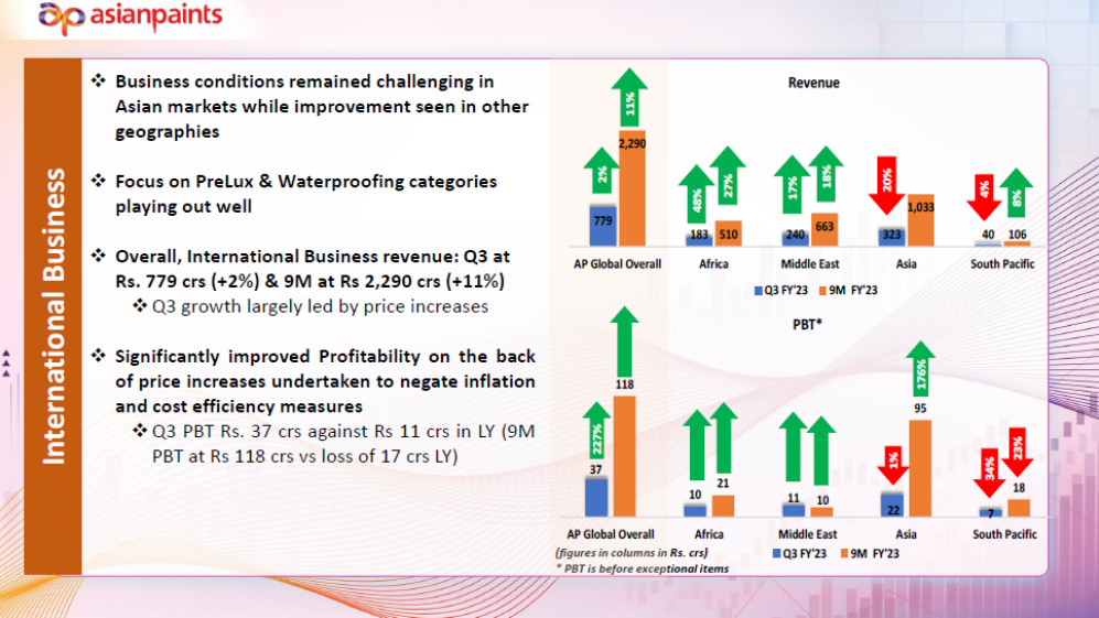國(guó)際市場(chǎng)在Q3稍顯疲軟,導(dǎo)致亞洲涂料該業(yè)務(wù)銷售增長(zhǎng)僅為2%,2023財(cái)年前9個(gè)月亞洲涂料國(guó)際業(yè)務(wù)增長(zhǎng)率約為11%,主要增長(zhǎng)點(diǎn)位于非洲和中東業(yè)務(wù),但斯里蘭卡、尼泊爾、孟加拉等地區(qū)受政治和匯率等影響,發(fā)展速度降低。
