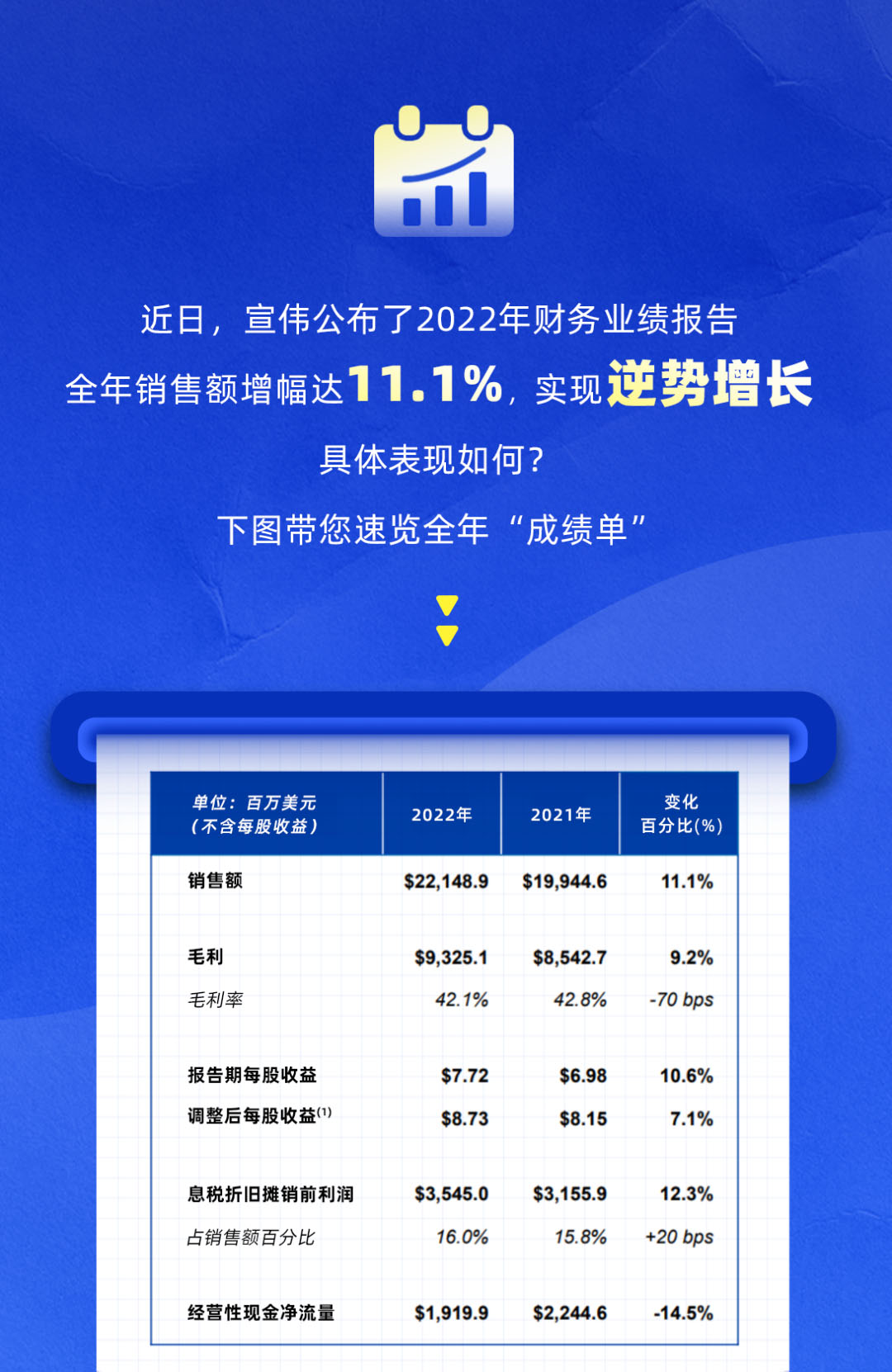 近日,宣偉公布了2022年財務(wù)業(yè)績報告全年銷售額增幅達(dá)11.1%,實現(xiàn)逆勢增長具體表現(xiàn)如何?本文帶您速覽其全年“成績單"。