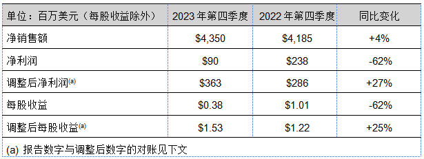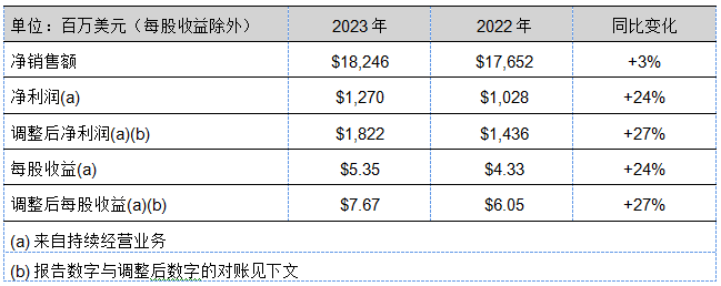 2023年度實現(xiàn)了創(chuàng)紀(jì)錄的凈銷售額,約為182億美元,較上年增長3%左右。在銷售價格上漲的帶動下,有機銷售額增長了3%。調(diào)整后每股收益也創(chuàng)下歷史新高,增長了27%,原因包括銷售價格上漲、投入成本下調(diào)、結(jié)構(gòu)性成本節(jié)省和有利的外幣折算,但被銷量下降部分抵消。年末,投入成本和庫存水平仍高于歷史水平。