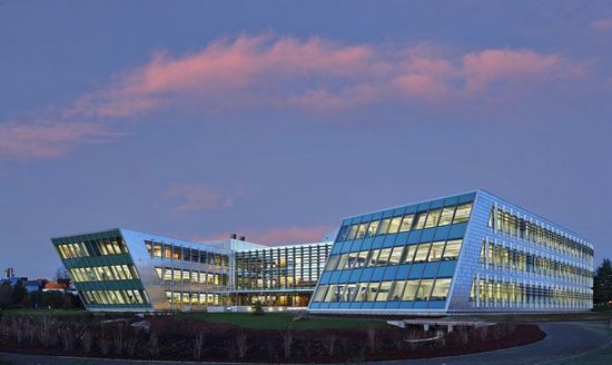 聯(lián)邦中心大廈,受2009年《美國復蘇與再投資法案》的資助,在5英畝的區(qū)域將聯(lián)邦中心南樓改建成,華盛頓州西雅圖西北區(qū)美國陸軍工程兵部隊總部。該建筑位列全美節(jié)能辦公建筑百強,并有望獲得美國“能源之星”的殊榮。建筑整體使用了可再生材料、可再生地板、可再生木材,是全美第一個使用復合地板系統(tǒng)的建筑。建筑排放的廢水經(jīng)過過濾后匯集到池塘和雨水花園。其雨水再利用系統(tǒng)收集的雨水經(jīng)處后可重新用于廁所沖洗、屋頂灌溉、還可為屋頂降溫。該系統(tǒng)可以減少80%飲用水的使用,并削減14%灌溉水需求。