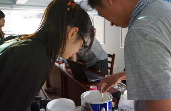 拿起板刷,在樣板上來回涂抹;風(fēng)干后,學(xué)生們觸摸漆面的質(zhì)地,觀察成品的效果,在實(shí)地研究學(xué)習(xí)水漆涂裝效果。近日,根據(jù)高等教育有關(guān)校企合作走“產(chǎn)、學(xué)、研”相結(jié)合道路的發(fā)展要求,武漢華中科技大學(xué)建筑系14級學(xué)生前往晨陽水漆武漢旗艦店實(shí)地觀摩學(xué)習(xí)水漆的調(diào)配與涂刷過程。晨陽水漆武漢地區(qū)銷售代表王金偉為同學(xué)們進(jìn)行了地坪漆及內(nèi)墻漆種類、參數(shù)、施工方法等一系列的培訓(xùn)講解。