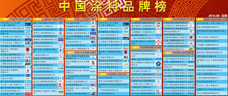 2014年 8月27日,“2013中國(guó)涂料品牌榜頒獎(jiǎng)典禮”在沈陽(yáng)隆重舉行。中國(guó)涂料工業(yè)協(xié)會(huì)、中國(guó)房地產(chǎn)研究會(huì)、中華環(huán)保聯(lián)合會(huì)、中國(guó)涂料產(chǎn)業(yè)技術(shù)創(chuàng)新戰(zhàn)略聯(lián)盟等多家行業(yè)協(xié)會(huì)的領(lǐng)導(dǎo)出席了頒獎(jiǎng)典禮并擔(dān)任頒獎(jiǎng)嘉賓。出席本次頒獎(jiǎng)典禮的還有來(lái)自全國(guó)的涂料生產(chǎn)企業(yè)、涂料用原材料及顏填料生產(chǎn)企業(yè)和涂料裝備生產(chǎn)企業(yè)的300多名代表。