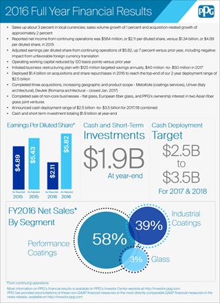 PPG公司董事長(zhǎng)兼首席執(zhí)行官M(fèi)ichaelH.McGarry表示:“盡管全球經(jīng)濟(jì)增長(zhǎng)緩慢,各地區(qū)表現(xiàn)參差不齊,再加上非常不利的匯率影響,我們第四季度和全年調(diào)整后每股攤薄收益仍然實(shí)現(xiàn)了穩(wěn)步增長(zhǎng)。通過提高銷量,積極的成本管控,加上多項(xiàng)致力于盈利增長(zhǎng)的現(xiàn)金部署,公司在2016年仍然實(shí)現(xiàn)了業(yè)務(wù)發(fā)展的各項(xiàng)里程碑!
